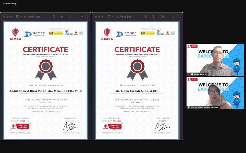 EXPECTO comes as a project including an online campaign series and main event. The online campaign series were held 2 times through social media such as Instagram, TikTok, and many more with engaged Media Partner to take part in this celebration. The main event was held online on 23 January 2022 in the form of an essay competition held online using ZOOM Teleconference Meeting, which consists of the presentation of the top 10 essays submitted and also the announcement of the winners. This essay competition has the theme “Accessibility Issues Surrounding Universal Health Coverage in Indonesia and Its Solution”. All essays, Powerpoint slides and presentations are in English. This can help participants and committees in honing their English skills.