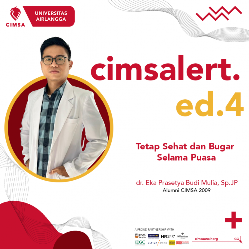 Selamat Menjalankan Ibadah Puasa bagi teman-teman yang sedang menjalankan yaa, Semangatt puasanya!! NAHH Akhirnyaa CIMSAlert kembali lagi pada edisi ke-4 di kepengurusan 2022/2023 untuk menemani kalian semua dan kali ini merupakan edisi spesial khususnya bagi teman-teman yang sedang puasa tapi ingin tetap sehat dan bugar. Well, edisi kali ini kita mendapatkan kesempatan yang luar biasa untuk membicarakan topik ini bersama salah satu Alumni dengan spesialisasi di bidang kardiologi yang tentunya sudah sangat paham dengan topik yang kita bawakan kali ini nih, siapa lagi kalau bukan Alumni kita yang keren banget, dr. Eka Prasetya Budi Mulia, Sp. JP! di balik kesibukan beliau, dr. Eka tetap bersedia menyempatkan waktu dan membagikan ilmu nya kepada kita nih. Penasaran kan? yuk simak lebih lanjut untuk mengetahui penjelasannya!