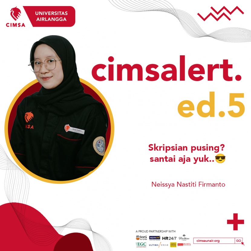 Eh kalem aja! Di edisi CIMSALERT edisi ke-5 ini, salah satu senior kita, kak Neissya Nastiti Firmanto, bakalan sharing pengalamannya sekaligus bagiin tips and trick ngerjain skripsi spesial buat kita nih! Gimana ya cerita kak Neissya dalam menyelesaikan tugas akhirnya sebagai mahasiswa? Kepo kannn… yuk ikutin!